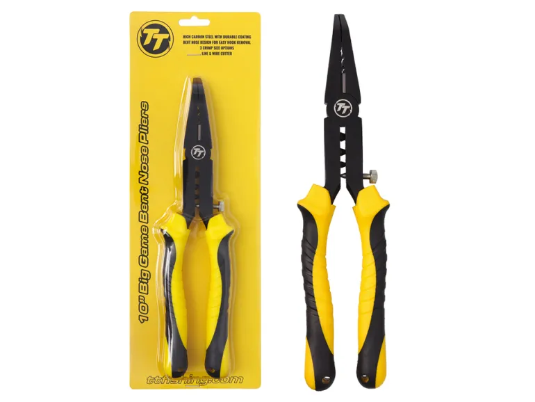 The Tackle Tactics Big Game Pliers are a versatile 10-inch tool perfect for game and offshore fishing. Crafted from high-carbon steel and finished with a durable PTFE coating, these pliers are built to withstand the rigors of heavy-duty use while offering multiple functionalities.