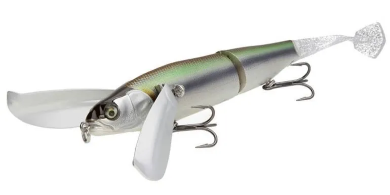 The thin body is designed to present a combination of 4 different action elements. 1) Volume of a big bait – it replicates a large baitfish, which big predators like. Its large body stirs the water. 2) Jointed bait sounds and action – the highly appealing action and sound of a jointed bait moving through the water attracts fish from a wide range.3) Sound and wave motion generated by a crawler bait – The attractive sound and wave motion created by the wings strongly appeals to target fish in the area and leads them to explode from the depths below.4) Natural swimming action of a swimbait – the shad tail applied to the rear of the body moves smoothly in concert with the action of the body. The natural wave motion is perfect for targeting large fish.