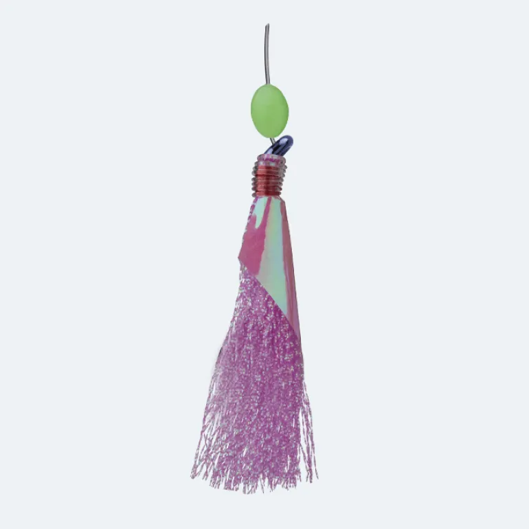 Each hook carries shimmering fibers to boost the presentation of the rig and that come in four different colour combinations: yellow tang (chartreuse), smoking salmon (pink), red fang (red-orange), flying fish (blue-silver).