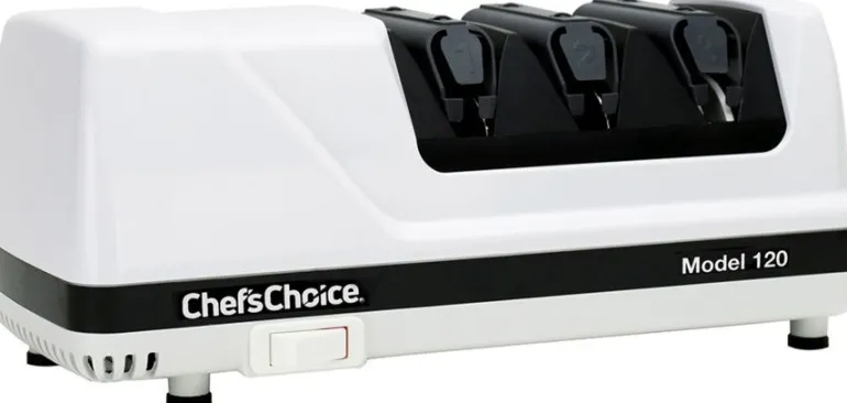 The 120 professional 3-stage electric knife sharpener is the ideal solution for 20-degree class knives. Using 100 percent diamonds, the hardest natural substance on earth, our patented abrasives sharpen edges faster and easier. This sharpener improves cutting performance by creating 3 distinct facets set at different angles to form a longer lasting, ultra-sharp edge. The first stage reshapes straight-edge knives using a coarse abrasive, while the second stage uses medium abrasives to sharpen the knife edge. In the final stage, patented stropping disks create an unparalleled polished finish. Precision angle guides ensure accurate sharpening throughout the entire blade length and eliminate any guesswork. This unit is designed to work with both straight-edge and serrated knives.
