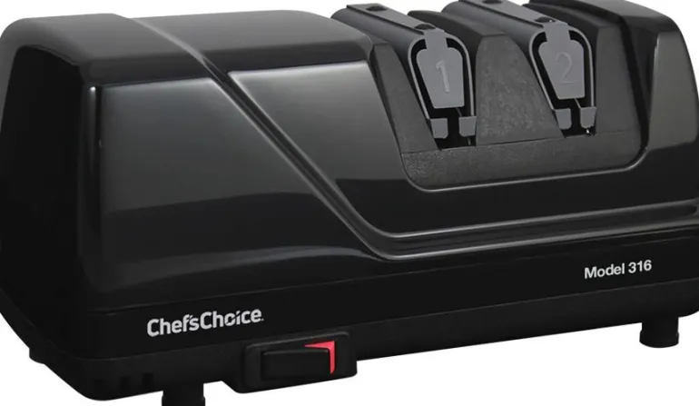 The Chef’sChoice Model 316 has two sharpening stages that sharpen the edge at 15 degrees. The first stage hones each side of the edge with fine 100% diamond abrasives. The second stage polishes the edge using ultra-fine 100% diamond abrasives. In both Stage 1 and 2, the left side and the right side of the blade are sharpened separately, which allows the user to hone and polish the traditional single-beveled Japanese blades. The contemporary Japanese blade, Chinese cleavers and modern European style knives should be honed and polished on both sides of the blade. The traditional single-bevel Japanese blade must be honed and polished primarily on the front side of the blade, which has the large factory bevel.