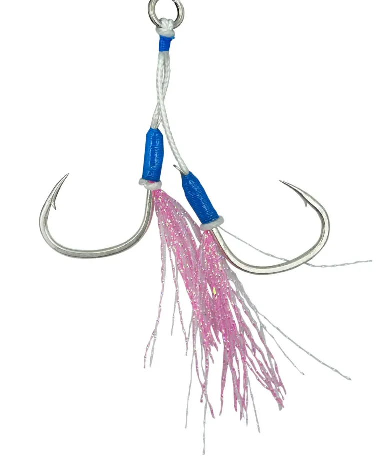 Professionally tied with “Fluorocore Cord” using ultra sharp spade styled slow jigging hooks. Our sleek design allows for minimum water resistance maximising jig action. We use 2 toned high quality UV tinsel to increase bite rates. Our sizes caters for offshore and shore jigging applications including micro, slow pitch and deep drop jigging. Can be attached at the top of jigs and also run as a rear stinger.