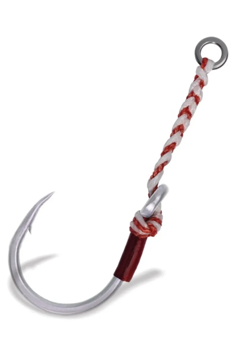 A perfect match between Dyneema for flexibility (white braid) and kevlar for incredible abrasion resistance (red braid)